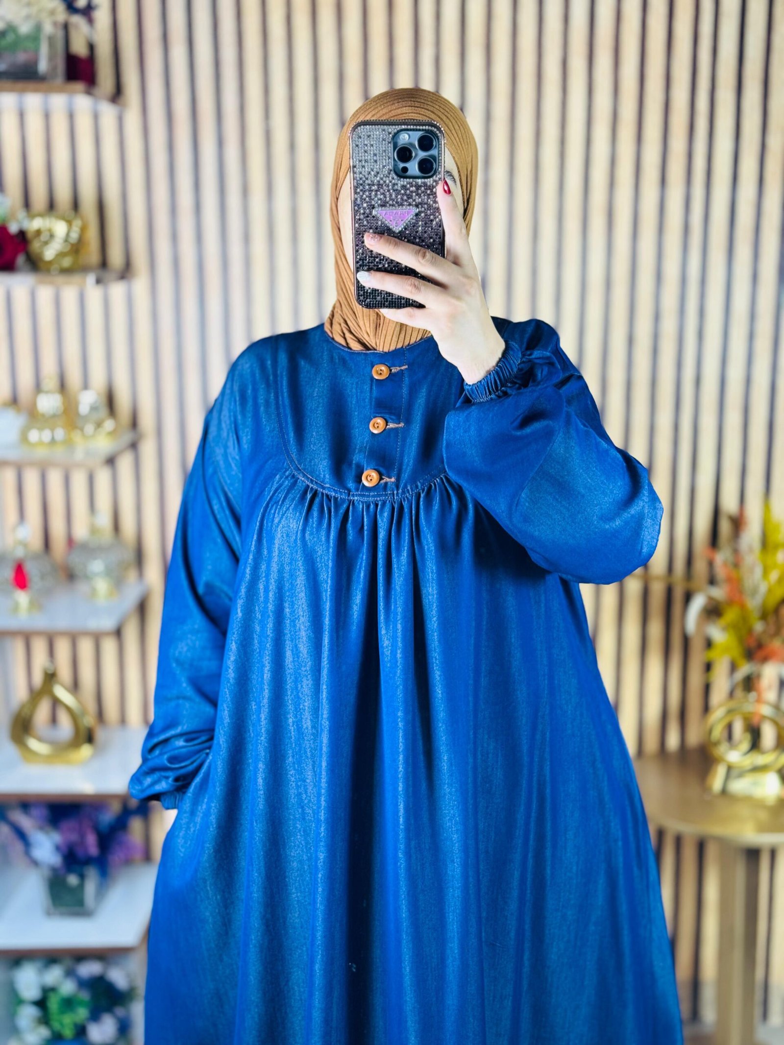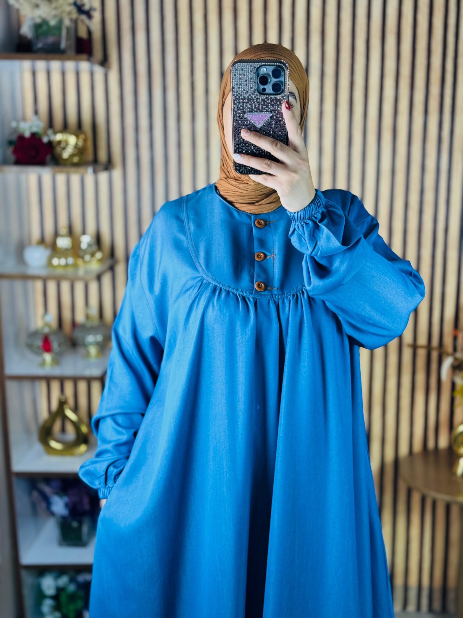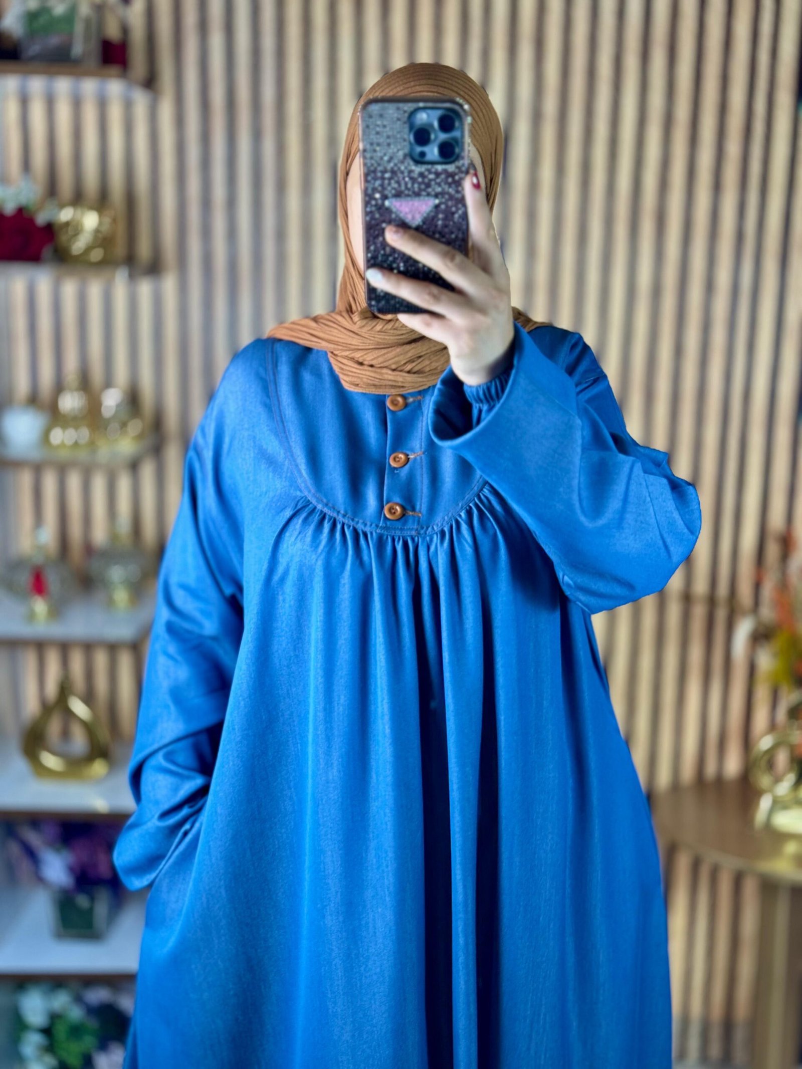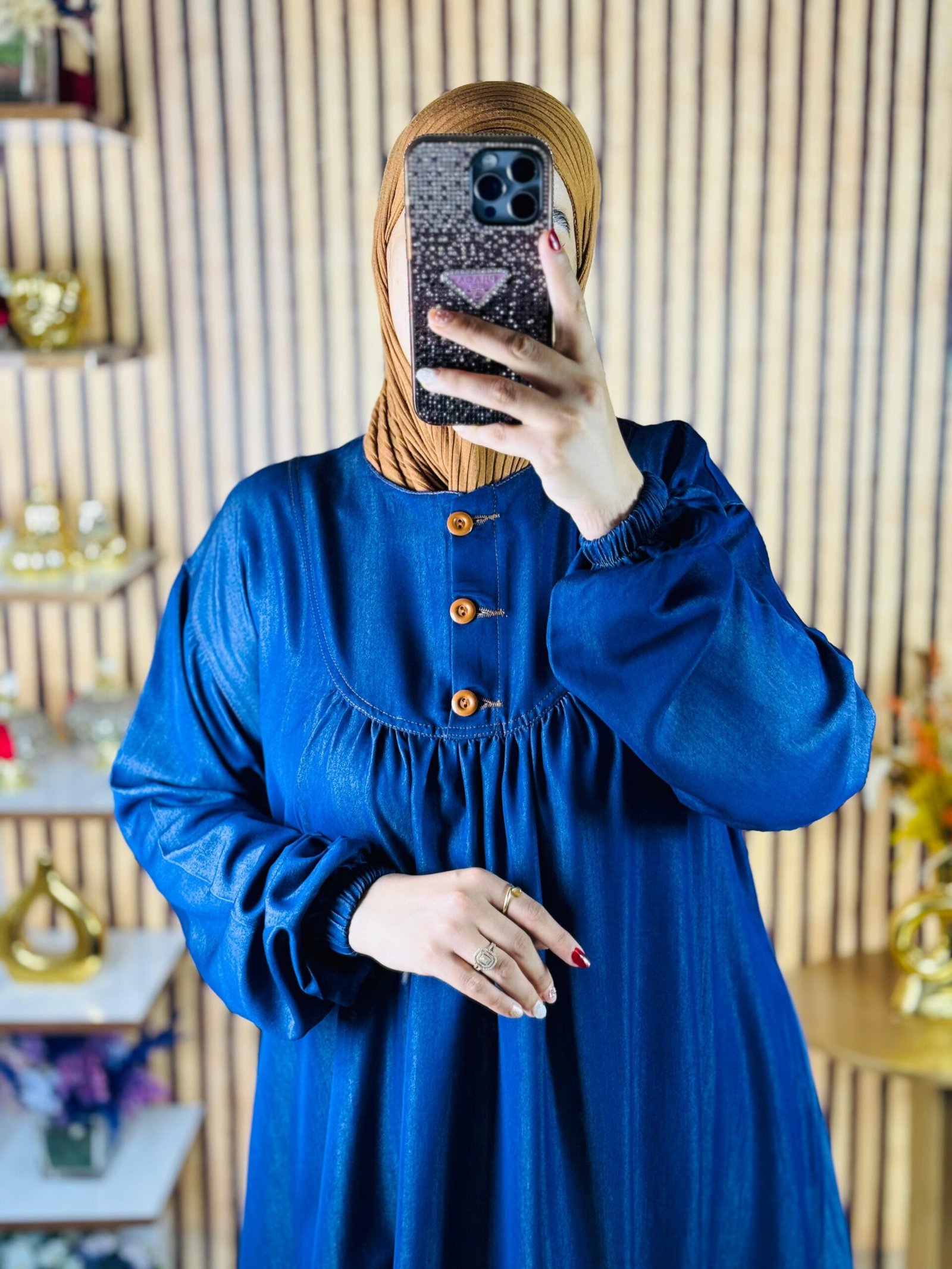 اكتشفي الأناقة والبساطة في جلابة عصرية واسعة باللون الأزرق الراقي.